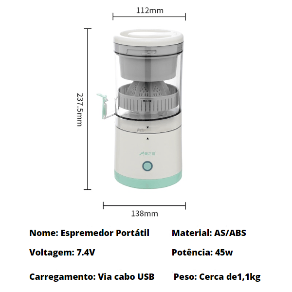 Funciona com bateria, recarregável via USB. o Espremedor De Frutas da Morangoni é a maneira mais prática e rápida de ter seu suco natural e super fresco. Ele aproveita 100% do suco, sem resíduos e sem desperdício.